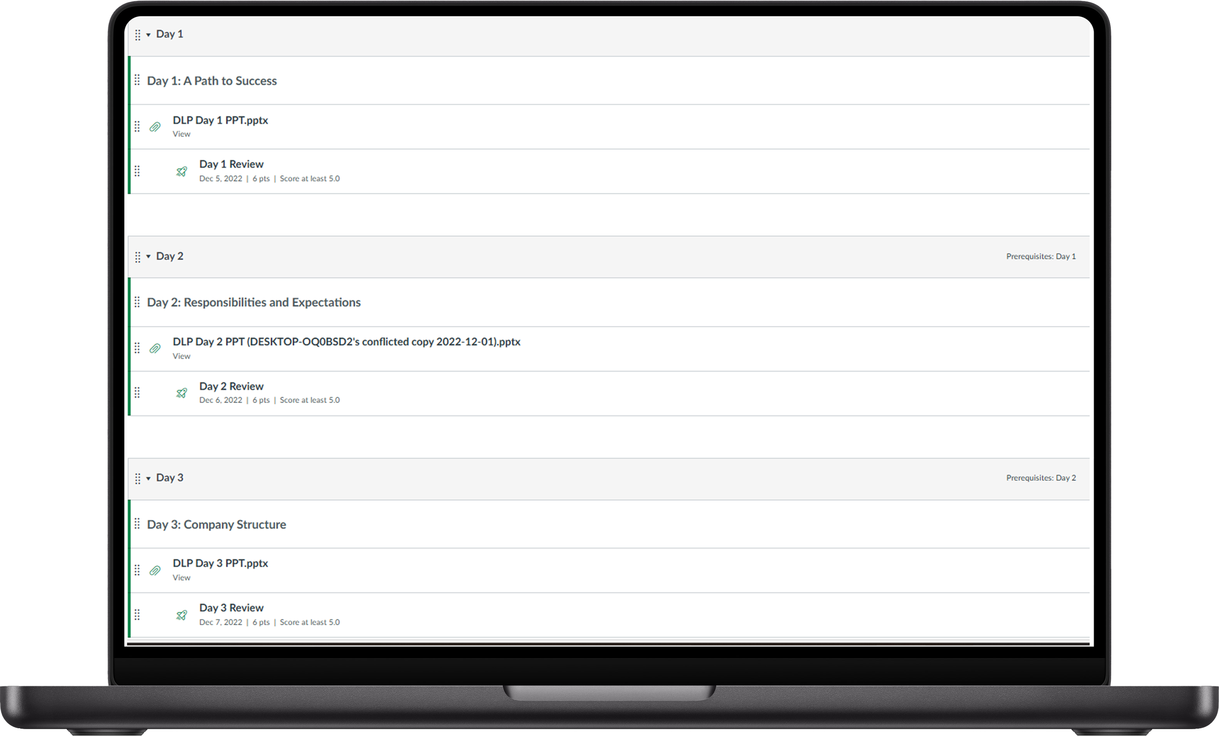 The training program was delivered asynchronously over five days in Canvas. Learners had the flexibility to complete the training at their own pace within the 5-day structure, with each day’s content progressively building upon the last. The extended timeframe allowed for more manageable learning, reducing the sense of being rushed and improving information retention.