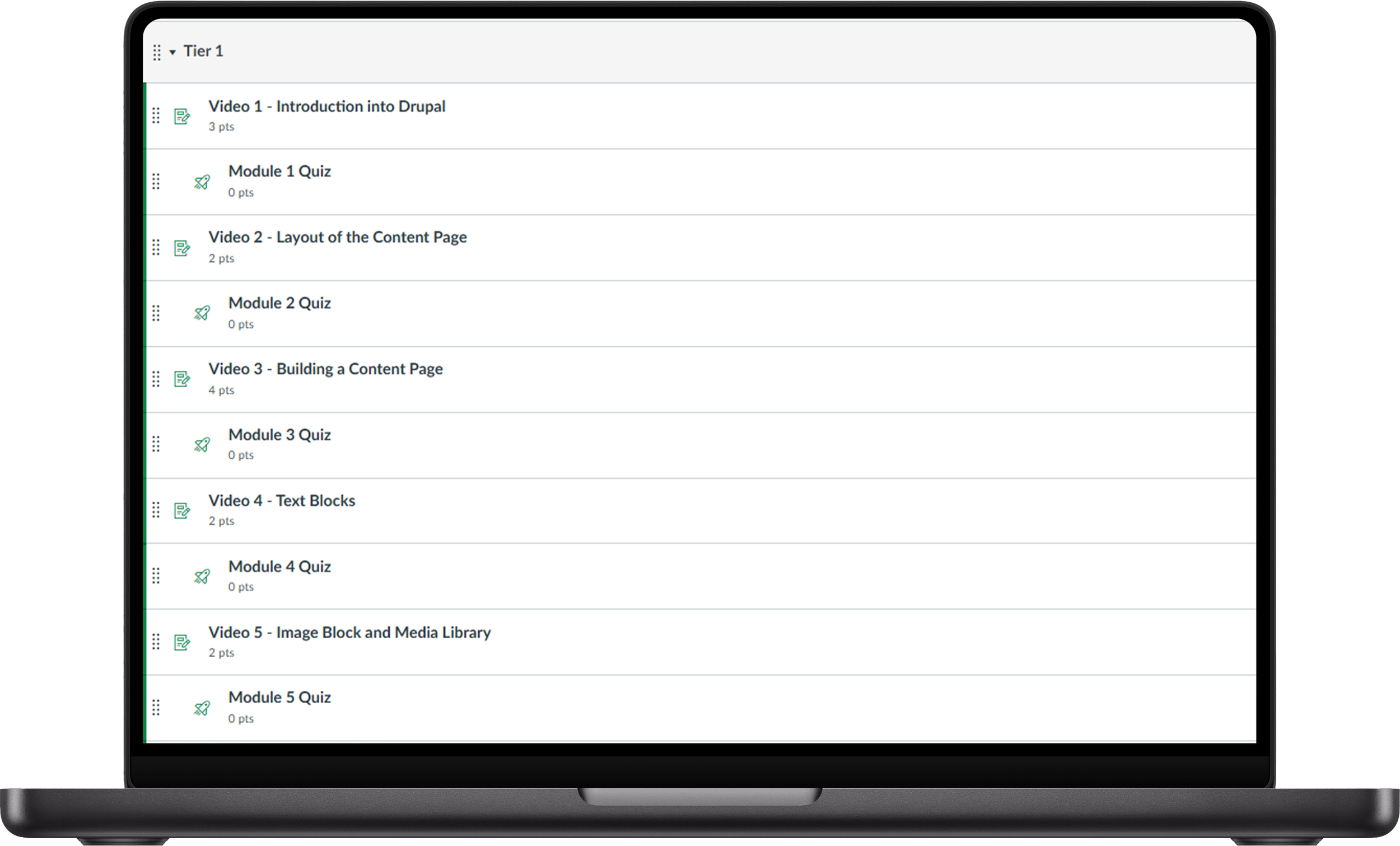 For this project, I was presented with the opportunity to redesign a previously created training course for a program called “Drupal”. This is a web development software that the University uses to design their program pages and was an integral tool in the responsibilities of the IT department. I had no prior experience with this software, but with the help of IT SMEs and through my training design and program management expertise, we were able to rebuild this training into an asynchronous Canvas course that the University still uses today. The program contained 16 total lessons, complete with videos, supporting documents, quizzes after each lesson and a final survey to gauge how users felt about the new training for continuous improvement.